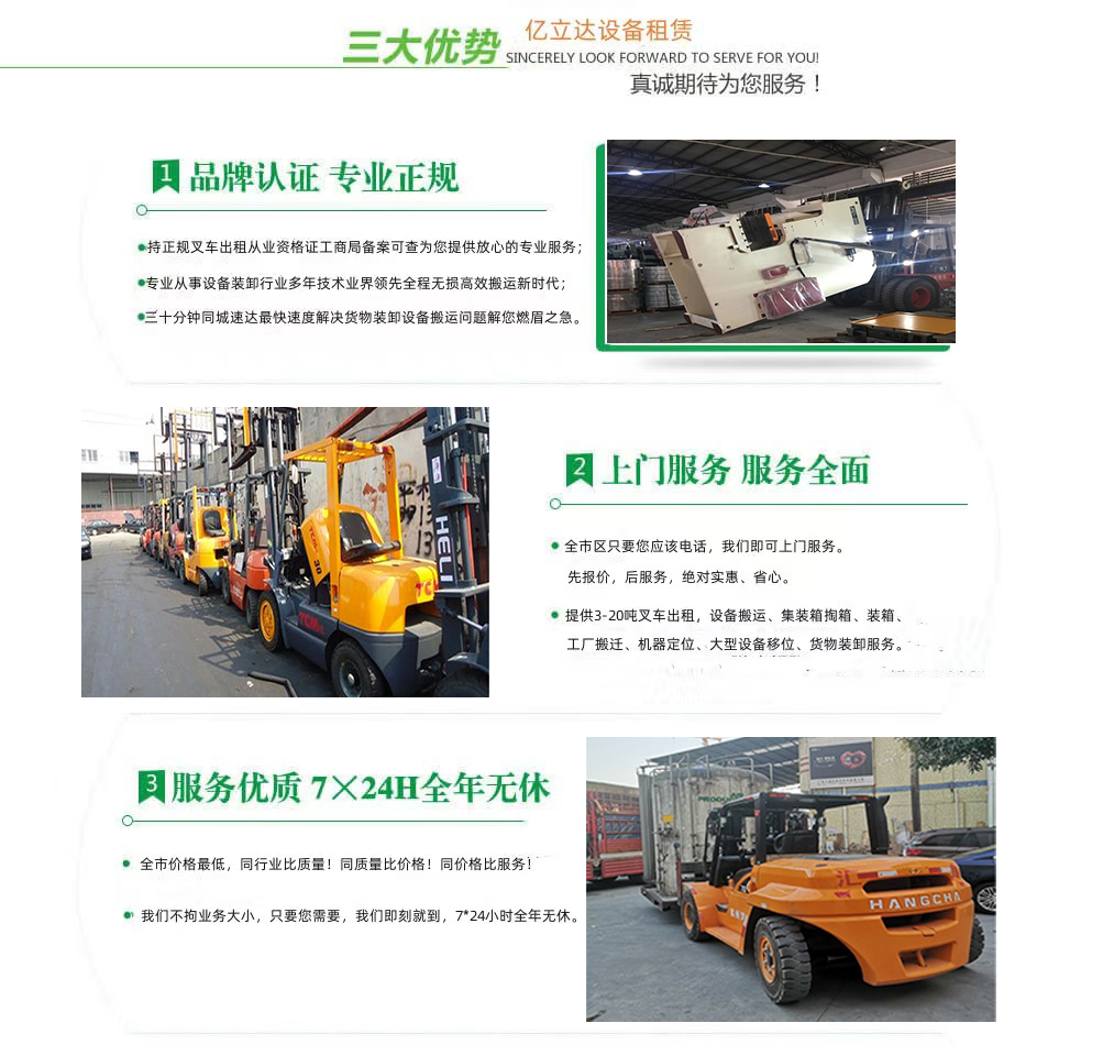 亿立达设备租赁有限公司是工商局准许的北京工业大学专业叉车出租公司,公司本着诚信、服务、效率、创新的经营理念,用精湛的技术,真诚的服务,为众多客户提供优质的服务,同时获得信赖与支持。专业提供北京工业大学3-20吨叉车出租、叉车租赁、设备搬运、集装箱掏箱装箱、机器移位定位、货物装卸、工厂搬迁、安全可靠,收费透明,价格便宜,随叫随到,24小时上门服务!本公司叉车吊车师傅对各种设备搬运装卸都有深刻探讨和研究。很多的疑难设备搬运,通过我公司的叉车师傅都能迎刃而解。对各种进口设备、国产机器、大型设备搬迁、高难度搬迁、各种精密仪器、医疗设备、科研设备等都能搬运; 提供全市 24 小时上门装卸搬运服务。同时提供厂房搬迁服务。 ...